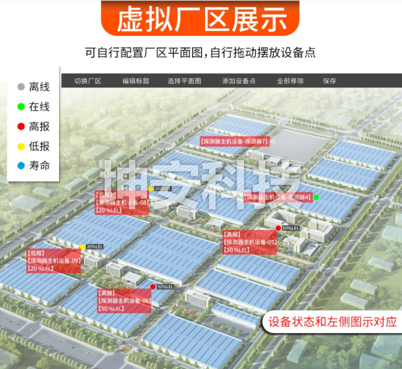 (1) 实时监测生产车间、仓库等处附近可燃气体和有毒气体的含量,达到一定浓度时实时报警。